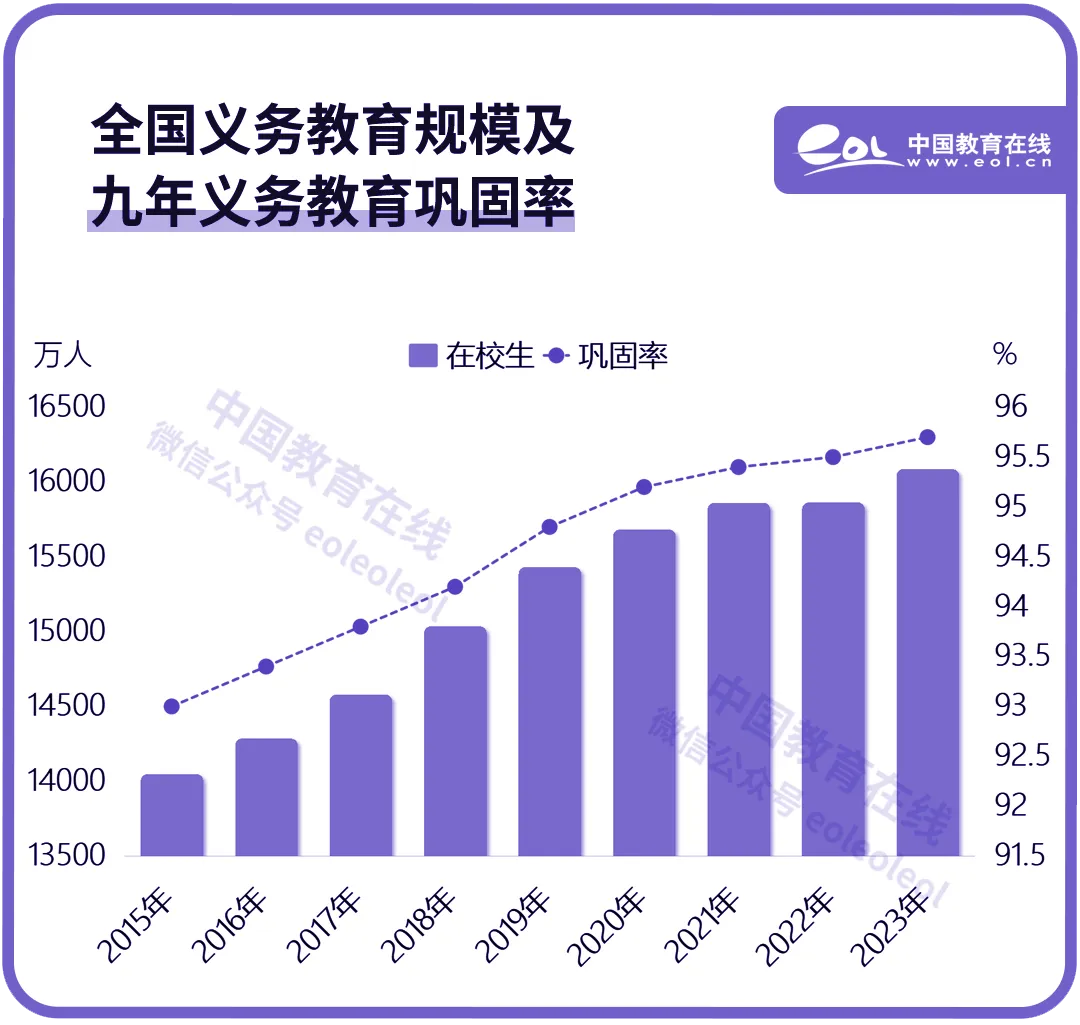 2015年,義務(wù)教育鞏固率為93%,到2023年,九年義務(wù)教育鞏固率95.7%,比2015年提高了2.7個(gè)百分點(diǎn),義務(wù)教育擴(kuò)優(yōu)提質(zhì)進(jìn)一步推進(jìn)。