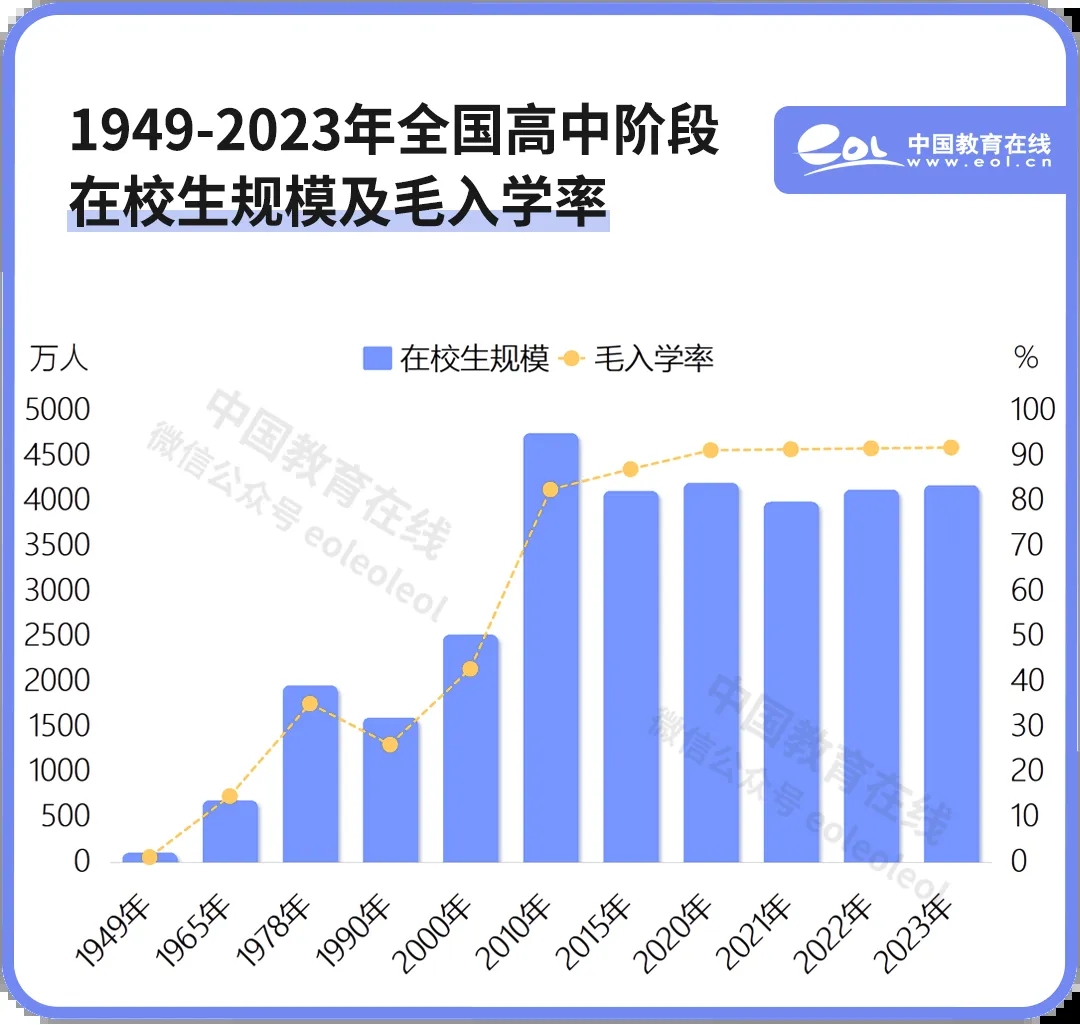 2023年我國(guó)高中階段教育共有學(xué)校2.2萬(wàn)所;其中,普通高中1.5萬(wàn)所,比1949年的1597所增長(zhǎng)9倍。