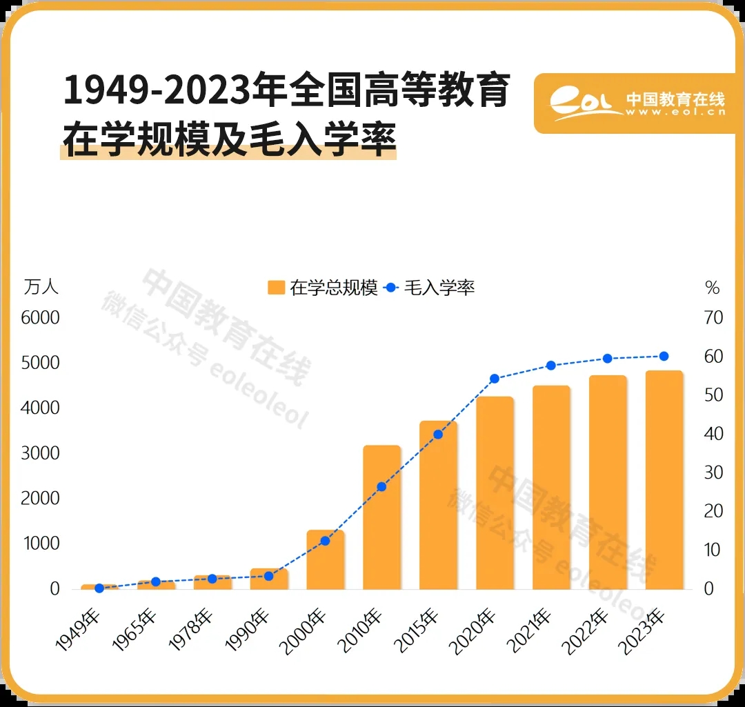 2023年,我國(guó)高等教育毛入學(xué)率達(dá)到60.2%,比1949年提高59.9個(gè)百分點(diǎn),提前完成“十四五”規(guī)劃目標(biāo)。