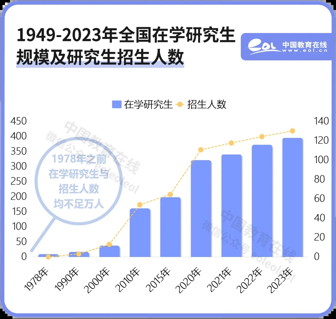 1949年,我國(guó)研究生在學(xué)人數(shù)僅為629人;到1978年突破萬(wàn)人;1993年突破十萬(wàn)人,2006年突破百萬(wàn)人,2020年,研究生在學(xué)規(guī)模突破300萬(wàn)大關(guān),2023年達(dá)到388萬(wàn)人。