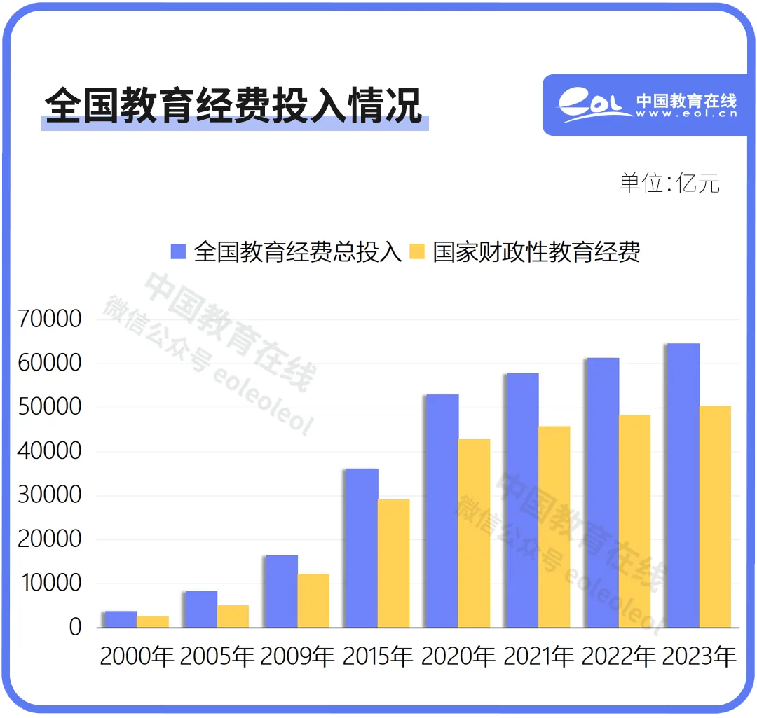 2023年,全國(guó)教育經(jīng)費(fèi)總投入為64595億元,比上年增長(zhǎng)5.3%。其中,國(guó)家財(cái)政性教育經(jīng)費(fèi)為50433億元,首次超過(guò)5萬(wàn)億元。