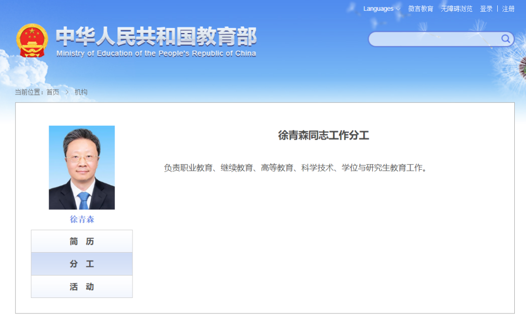 近日,教育部官網(wǎng)更新了教育部領(lǐng)導(dǎo)的分工,徐青森副部長分管職業(yè)教育、繼續(xù)教育、高等教育、科學(xué)技術(shù)、學(xué)位與研究生教育工作。