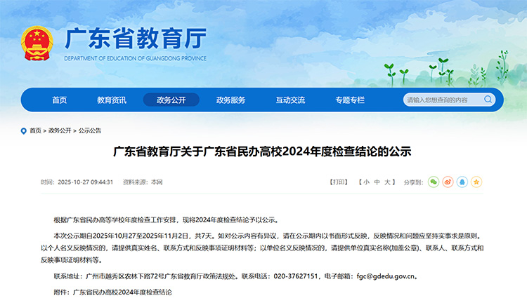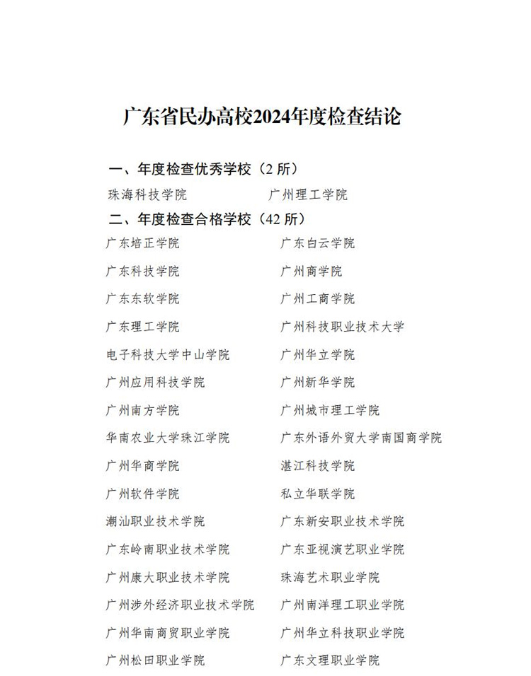10月27日,廣東省教育廳公示該省民辦高校2024年度檢查結(jié)論。公示名單顯示,50所民辦院校中,2所優(yōu)秀,42所合格,6所基本合格。