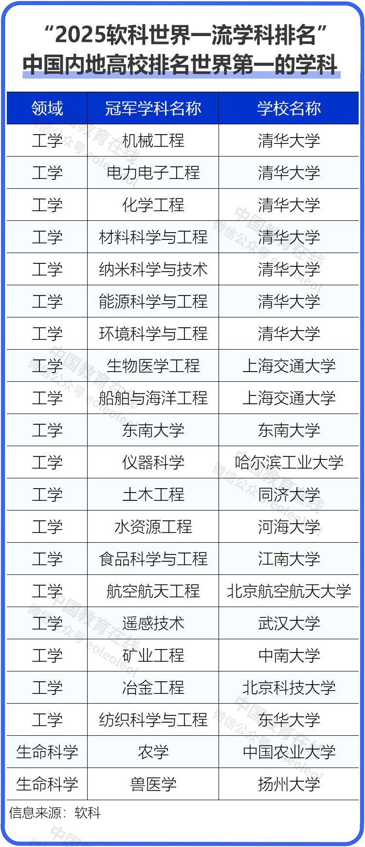 2025軟科世界一流學(xué)科排名中,中國內(nèi)地高校在電力電子工程、生物醫(yī)學(xué)工程、材料科學(xué)與工程3個學(xué)科首度問鼎世界第一,使得中國內(nèi)地高校的全球冠軍學(xué)科增加到21個。分別是清華大學(xué)(機(jī)械工程、電力電子工程、化學(xué)工程、材料科學(xué)與工程、納米科學(xué)與技術(shù)、能源科學(xué)與工程、環(huán)境科學(xué)與工程)、上海交通大學(xué)(生物醫(yī)學(xué)工程、船舶與海洋工程)、東南大學(xué)(通信工程)、哈爾濱工業(yè)大學(xué)(儀器科學(xué))、同濟(jì)大學(xué)(土木工程)、河海大學(xué)(水資源工程)、江南大學(xué)(食品科學(xué)與工程)、北京航空航天大學(xué)(航空航天工程)、武漢大學(xué)(遙感技術(shù))、中南大學(xué)(礦業(yè)工程)、北京科技大學(xué)(冶金工程)、東華大學(xué)(紡織科學(xué)與工程)、中國農(nóng)業(yè)大學(xué)(農(nóng)學(xué))、揚州大學(xué)(獸醫(yī)學(xué))。其中,揚州大學(xué)首次擁有全球冠軍學(xué)科。