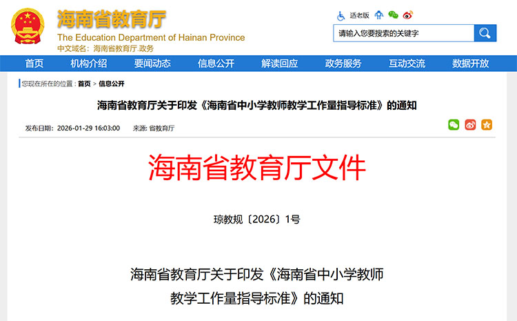 近日,海南省教育廳印發(fā)《海南省中小學教師教學工作量指導標準》(以下簡稱《指導標準》),進一步規(guī)范課時基準,保障開齊開足課程。