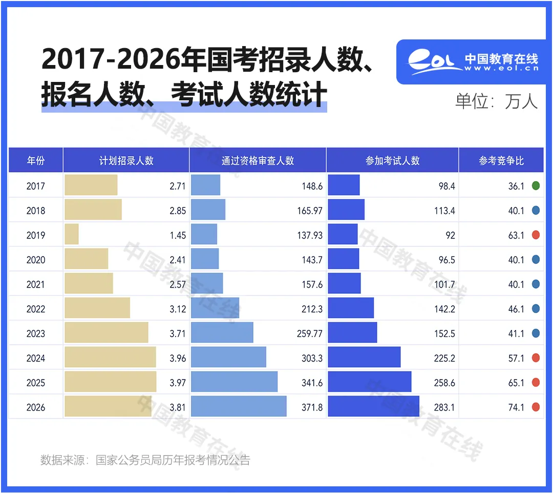 11月30日,2026年公務(wù)員國考開考,通過資格審查的報名人數(shù)371.8萬人(實際參考人數(shù)為283.1萬人),共計劃招錄3.81萬人,比去年減少0.16萬人,錄取比74:1,比去年的65:1有明顯增長。