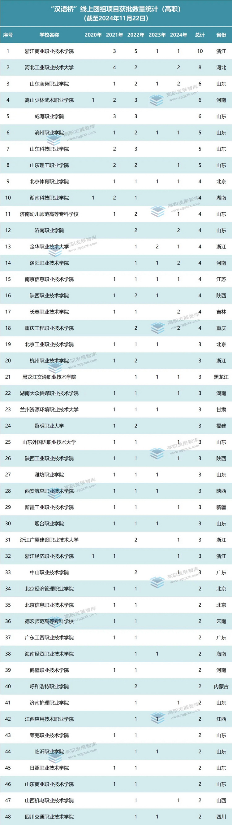 近日,高職發(fā)展智庫對漢語橋團組在線體驗平臺高職院校承辦的項目進行了統(tǒng)計。截至2024年11月22日,全國共有101所高職院校獲批“漢語橋”線上團組項目224項。