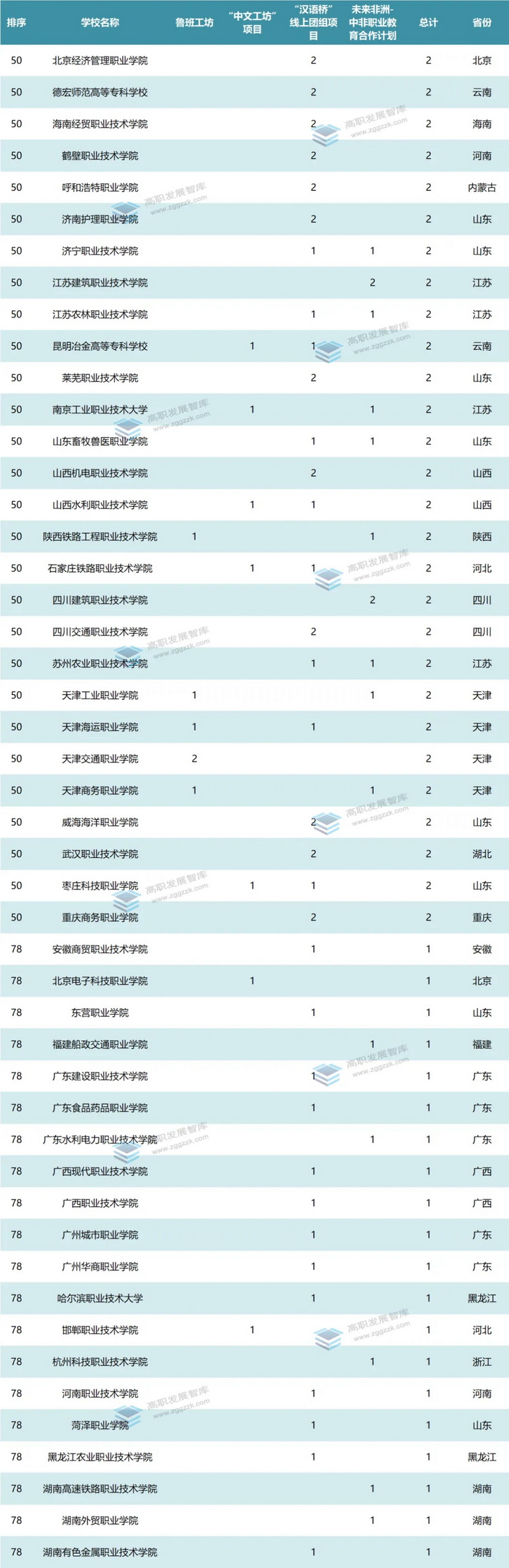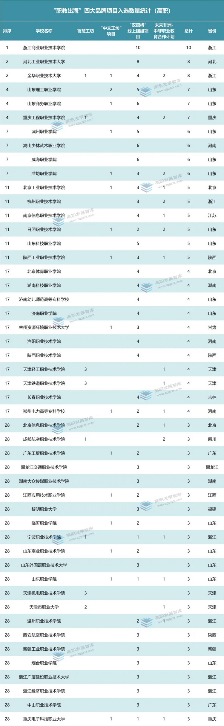 高職發(fā)展智庫對“職教出海”四大品牌項目魯班工坊、“中文工坊”項目、“漢語橋”線上團組項目、未來非洲-中非職業(yè)教育合作計劃進行了匯總統(tǒng)計,全國共有148所高職院校入選。