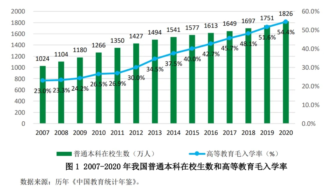 圖1呈現(xiàn)了2007—2020年我國高等教育毛入學(xué)率和普通本科高校的在校生數(shù)據(jù)。2007—2020年,高等教育毛入學(xué)率 逐年提高,2019年實(shí)現(xiàn)了高等教育普及化(51.6%),2020年繼續(xù)提高到54.4%。(注:高等教育毛入學(xué)率統(tǒng)計中的高等教育在學(xué)總規(guī)模不僅包括普通高等教育本??圃谛I鷶?shù)、研究生在校生數(shù),還包括成人本專科折合在校生數(shù)、成人夜大在校生數(shù)等。)我國普通本科在校生規(guī)模逐年增長,從1024萬人增加到1826萬人。