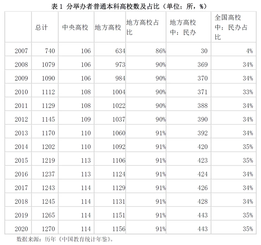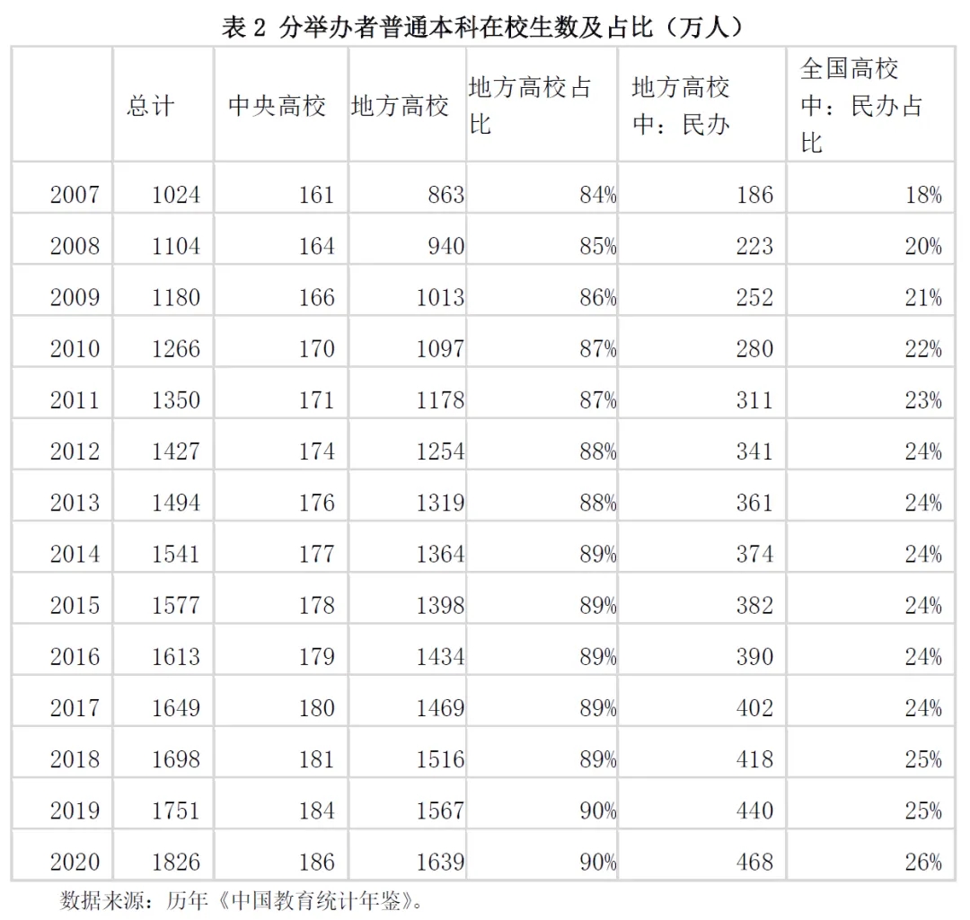 從學(xué)校數(shù)來看(表1),2007—2020年,中央高校增加了8所,地方高校增加了522所(占比從86%增加到91%);地方高校中,民辦高校增加了413所(在全國高校中占比從4%增加到35%)。從在校生數(shù)來看(表3),中央高校增加了25萬人,地方高校增加了776萬人(占比從84%增加到90%);地方高校中,民辦高校增加了282萬人(在全國高校學(xué)生數(shù)中占比從18%增加到26%)??傊?,在全國普通本科高校中,無論是學(xué)校數(shù)還是在校生數(shù),地方普通本科高校都占90%及以上,在規(guī)模上占據(jù)主體地位。