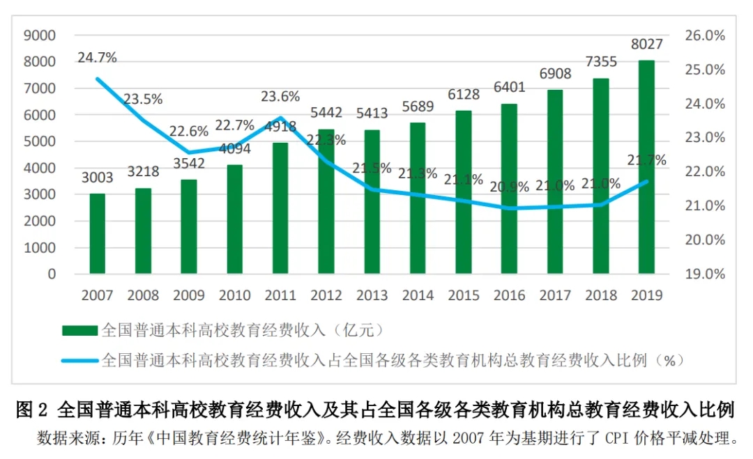 圖2和圖3顯示的是2007—2019年全國和地方普通本科高校(含民辦)教育經(jīng)費(fèi)收入及其占全國各級各類教育機(jī)構(gòu)教育經(jīng)費(fèi)總收入比例的情況。2007—2019年,全國普通本科高校教育經(jīng)費(fèi)收入從3003億元增長到8027億元,地方普通本科高校教育經(jīng)費(fèi)收入從1884億元增長到5186億元(數(shù)據(jù)經(jīng)過消費(fèi)者物價指數(shù)平減)。從2007—2019年我國普通本科高校教育經(jīng)費(fèi)收入占全國各級各類教育機(jī)構(gòu)教育經(jīng)費(fèi)總收入的比例來看,總體來看,全國普通本科高校的經(jīng)費(fèi)收入占比在21%~25%之間波動,地方普通本科高校的經(jīng)費(fèi)收入占比在13%~16%之間波動。