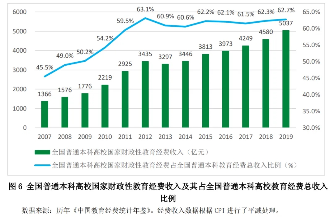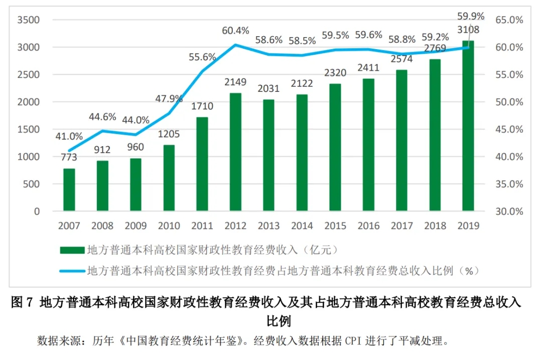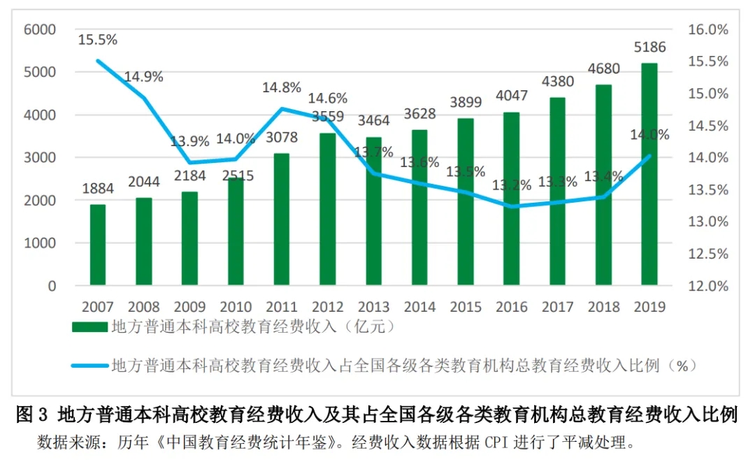 為進(jìn)一步加大地方高等教育財政投入,使地方高校更好地承擔(dān)起實(shí)施科教興國戰(zhàn)略和人才強(qiáng)國戰(zhàn)略、建設(shè)創(chuàng)新型國家的歷史使命,在高等教育以大規(guī)模擴(kuò)招為特征的外延式發(fā)展轉(zhuǎn)入以提高質(zhì)量為特征的內(nèi)涵式發(fā)展階段后,中央政府逐步進(jìn)行政策調(diào)整,在增加中央政府對地方高校(地方所屬公辦普通本科高校)支持的同時,提高地方政府投入高等教育的積極性。2010年財政部、教育部出臺《關(guān)于印發(fā)<中央財政支持地方高校發(fā)展專項(xiàng)資金管理辦法>的通知》(財教〔2010〕21號),在原“中央與地方共建高等學(xué)校專項(xiàng)資金”的基礎(chǔ)上,設(shè)立支持地方高校發(fā)展專項(xiàng)資金,支持地方高校的重點(diǎn)發(fā)展和特色辦學(xué)。2010年11月30日,財政部、教育部發(fā)布《關(guān)于進(jìn)一步提高地方普通本科高校生均撥款水平的意見》(財教〔2010〕567號),要求各地要根據(jù)高校合理需要,制訂本地區(qū)地方高校生均撥款基本標(biāo)準(zhǔn)。在此基礎(chǔ)上,結(jié)合財力情況、物價變動水平、高校在校生人數(shù)變化、工資標(biāo)準(zhǔn)調(diào)整等因素,建立地方高校生均撥款動態(tài)調(diào)整機(jī)制,逐步提高生均撥款水平。原則上,2012年各地地方高校生均撥款水平不低于12000元。2010年提高地方普通本科高校生均撥款水平的政策有效地確保了各省份及省級以下政府對地方高等教育的財政投入。此后,中央高校和地方高校之間差距開始逐步縮小。2010年,地方普通高校生均預(yù)算內(nèi)教育經(jīng)費(fèi)支出占中央普通高校生均預(yù)算內(nèi)教育經(jīng)費(fèi)支出的比例從42.68%增至46.94%,2012年升至60.53%,此后雖有下降,但一直維持在55%左右,2019年開始上升,2020 年達(dá)到 66.57%。