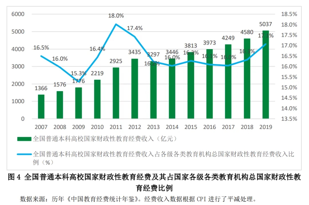圖4和圖5顯示的是2007—2019年全國和地方普通本科高校國家財政性教育經(jīng)費(fèi)收入及其占全國各級各類教育機(jī)構(gòu)國家財政性教育經(jīng)費(fèi)總收入比例的情況。2007—2019年,全國普通本科高校國家財政性教育經(jīng)費(fèi)收入從1366億元增長到5037億元,地方普通本科高校國家財政性教育經(jīng)費(fèi)收入從773億元增長到3108億元(數(shù)據(jù)經(jīng)過消費(fèi)者物價指數(shù)平減)。從各級各類教育機(jī)構(gòu)國家財政性教育經(jīng)費(fèi)總計中普通本科高校的占比來看,全國普通本科高校的占比在15%~18%之間波動,2011年最高,為18.0%;地方普通本科高校的占比在8%~11%之間波動, 2012年最高,為10.9%。