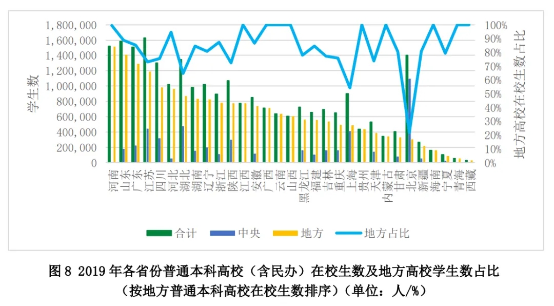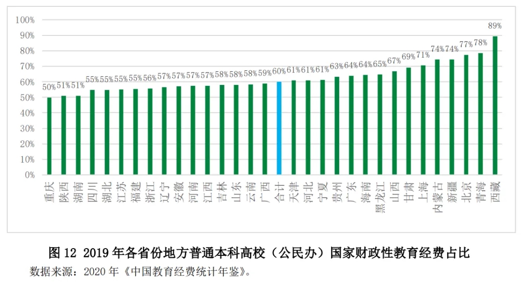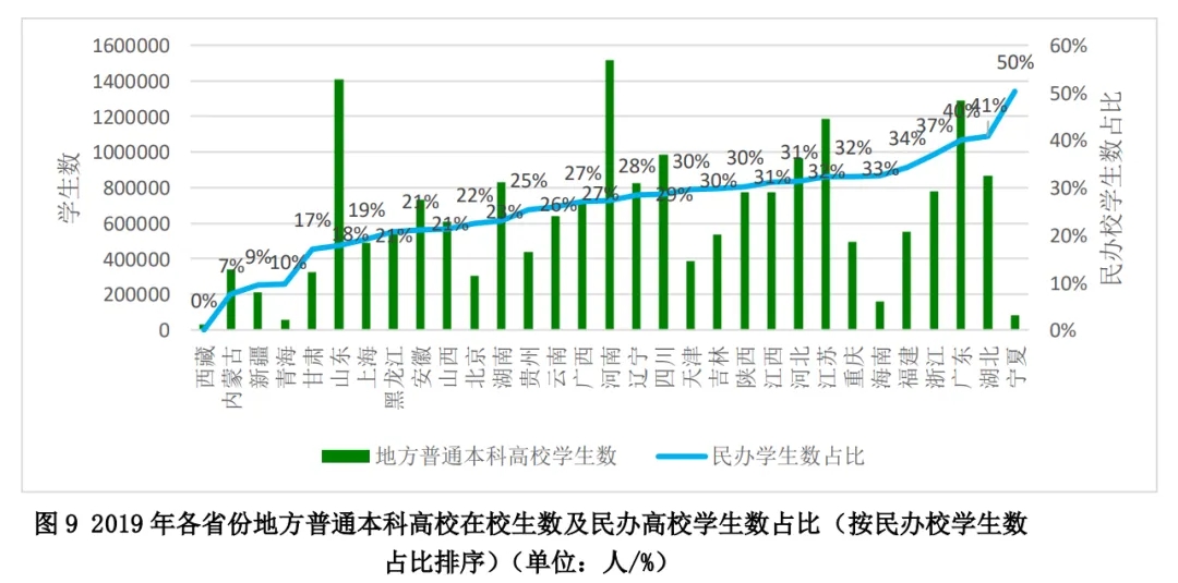 此外,本報告關(guān)于各省份高校間差異主要分析的是地方教育部門和其他部門辦的703所普通本科高校,不包括民辦普通本科高校,因此不能反映各省份地方普通本科高校的全貌。民辦高校在地方屬高校中占比38%,而且在各省份的分布差異很大,值得專門研究。