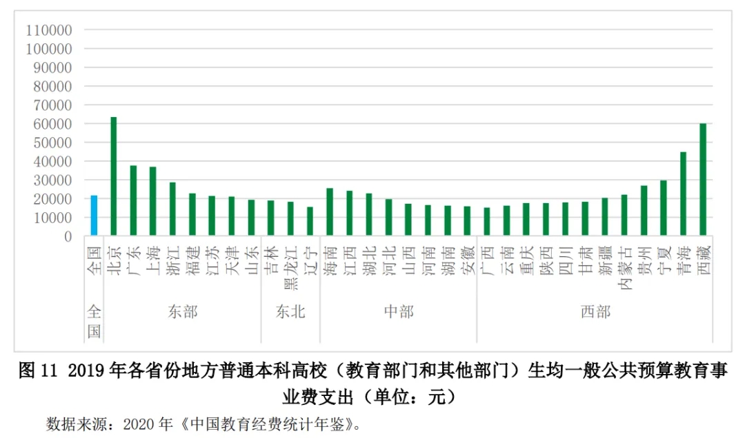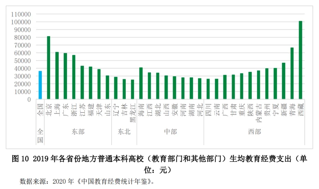 圖10顯示的是2019年各省份地方公辦普通本科高校生均教育經(jīng)費(fèi)支出。東部的北京、上海、廣東、浙江等地,以及西部的青海、西藏等,生均教育經(jīng)費(fèi)支出較高。東北地區(qū)、西部的四川、云南等地,生均教育經(jīng)費(fèi)支出較低。