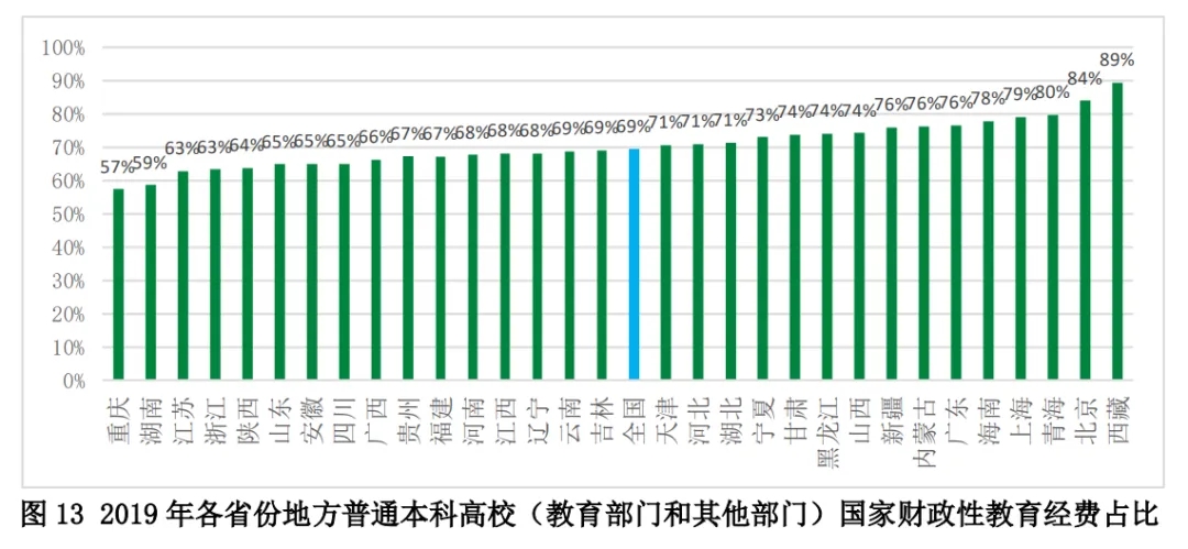 2019年,地方普通本科高校(公民辦)教育經(jīng)費(fèi)收入中國家財政性教育經(jīng)費(fèi)占比的全國平均水平約為60%,各省份存在一定的差異(見圖12)。占比高于70%的省份以西部為主,包括內(nèi)蒙古(74%)、青海(78%)等,東部的上海(71%)、北京(77%)占比也較高;占比低于55%的省份主要是中西部省份,包括中部的湖北(55%)、湖南(51%),西部的四川(55%)、陜西(51%)、重慶(50%),此外,東部的浙江(56%)、福建(55%)、江蘇(55%)占比也較低。