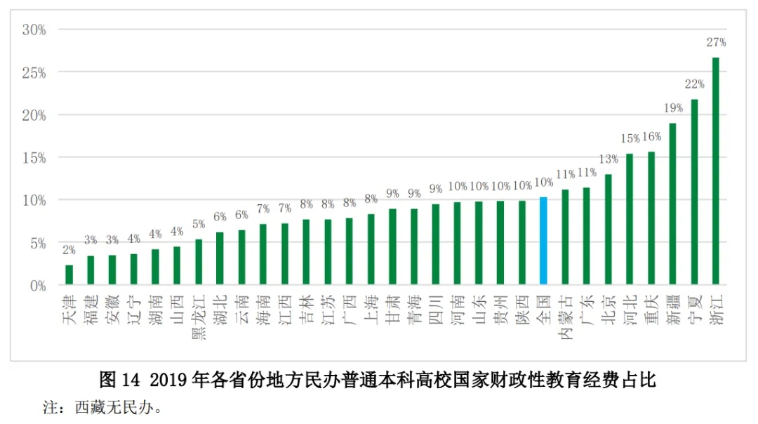 2019年地方民辦普通本科高校教育經(jīng)費(fèi)收入中國家財政性教育經(jīng)費(fèi)占比的全國平均水平約為10%,各省份也存在一定差異(圖14)。占比最高的省份為東部的浙江(27%),其次是西部的寧夏(22%)、新疆(19%)、重慶(16%),東部的河北(15%)、北京(13%)、廣東(11%)。占比低于5%的包括天津(2%)和福建(3%),中部的安徽(3%)、湖南(4%)、山西(4%),東北部的遼寧(4%)、黑龍江(5%)。