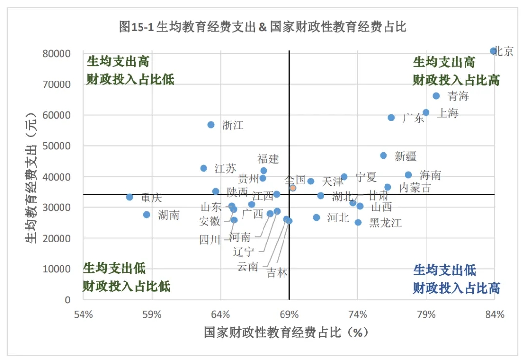 (1)生均教育經(jīng)費(fèi)支出和財政投入占比都較高的地區(qū),包括北京、上海、廣東、青海等。這類地區(qū)或者是經(jīng)濟(jì)發(fā)達(dá)地區(qū),或者是得到大量財政轉(zhuǎn)移支付的西部地區(qū)(經(jīng)費(fèi)投入高、而在校生規(guī)模小),因此財政投入水平較高,且生均教育經(jīng)費(fèi)支出水平也較高。
