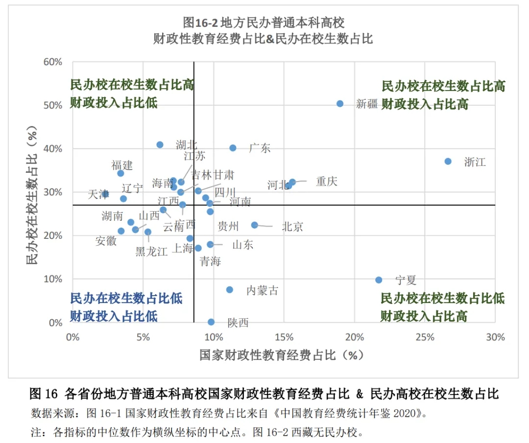 從地方普通本科高校(公民辦)、地方民辦普通本科高校的國家財政性教育經(jīng)費(fèi)占比,以及民辦高校在校生數(shù)占比來看(見圖16),各省份地方普通本科高校教育事業(yè)發(fā)展和教育投入情況呈現(xiàn)出幾種不同的類型: