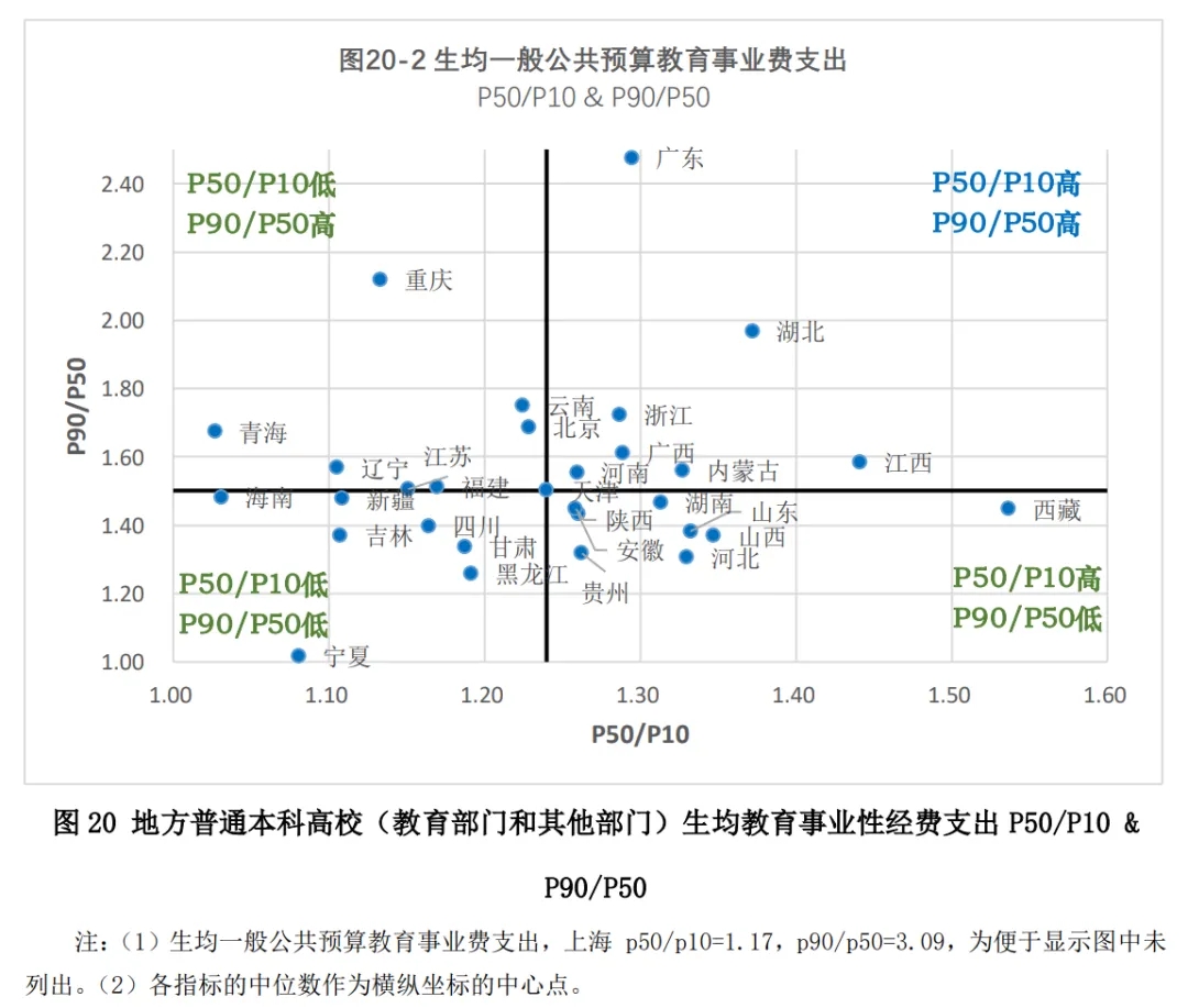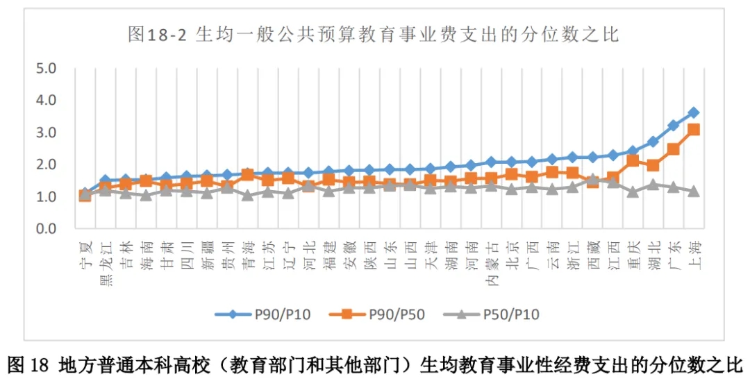 而從生均一般公共預(yù)算教育事業(yè)費(fèi)支出不同分位數(shù)之比來看,其顯示的特征與生均教育事業(yè)性經(jīng)費(fèi)支出不同分位數(shù)之比的情況基本類似。略有不同的是,部分省份的位置發(fā)生了變化,包括湖北、重慶、北京、四川、江西等省,其反映出的高校間差異在某些層次的高校之間更加凸顯。其中,湖北、重慶是最高的90分位數(shù)高校與中部高校之間的差異更凸顯,北京則是最高的90分位數(shù)高校與中部高校之間的差異略降;江西是中部高校與最低10分位數(shù)高校之間的差異更凸顯,四川則是中部高校與最低10分位數(shù)高校之間的差異略降。