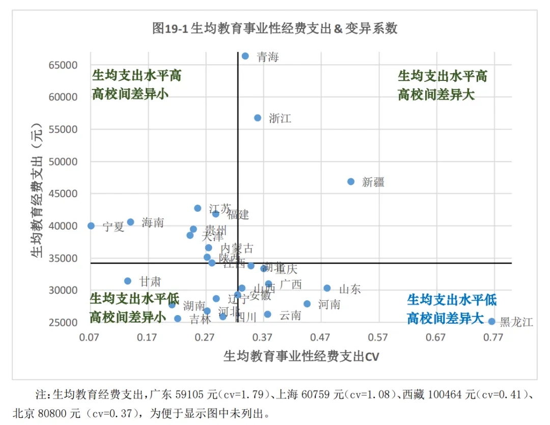 基于上述分析,我們從生均教育事業(yè)性經(jīng)費(fèi)支出水平及其變異系數(shù)綜合來看各省份的投入情況(見圖19):