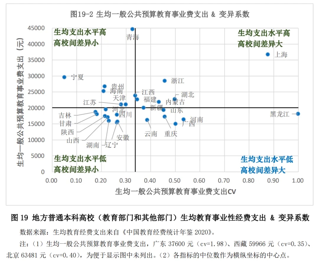 盡管我們從經(jīng)費(fèi)構(gòu)成以及生均支出水平方面,分析了各省份高校間差異和各省份省屬高校和市屬高校間差異,也用四象限圖對各省份的經(jīng)費(fèi)投入情況進(jìn)行了刻畫,但是,如何進(jìn)一步分析、解釋這些差異,還需要做更多具體的研究。