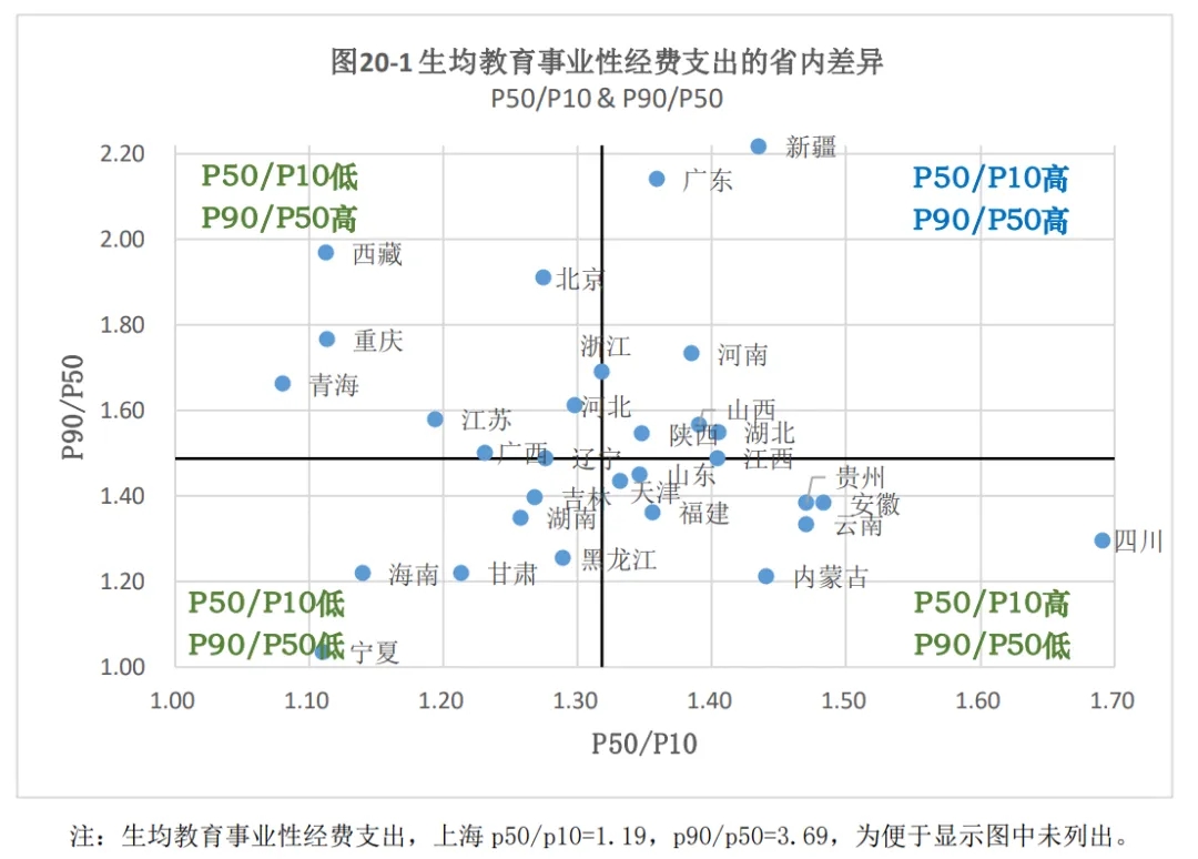 我們再從生均教育事業(yè)性經(jīng)費(fèi)支出不同分位數(shù)之比來看各省份投入的具體情況(見圖20):第一,頭部高校與中部高校之間、中部高校與下部高校之間差異都大的地區(qū),以東部、中部為主,包括廣東、河南、湖北等;第二,頭部高校與中部高校之間、中部高校與下部高校之間差異都小的地區(qū),主要是東北、西部地區(qū),包括黑龍江、吉林、寧夏等;第三,主要是頭部高校與中部高校之間差異大的地區(qū),包括上海、北京、重慶等;第四,主要是中部高校與下部高校之間差異大的地區(qū),以西部、中部為主,包括安徽、貴州等。