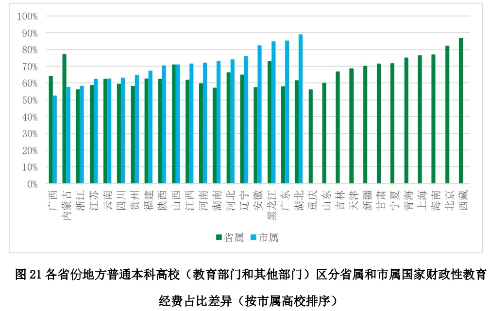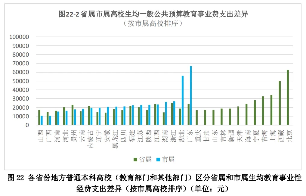 第二,報告分析了各省份的省屬高校和市屬高校之間的投入差異,而市屬高校和市屬高校在校生數(shù)占比僅為13%和10%,有些省份的市屬高校和在校生數(shù)少之又少,目前的分析僅停留在國家財政性教育經(jīng)費(fèi)占比、生均教育經(jīng)費(fèi)支出等指標(biāo)的比較,尚未深入分析。