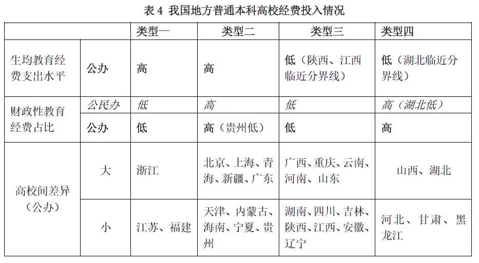 類型一:財政性教育經(jīng)費(fèi)占比低、生均教育經(jīng)費(fèi)支出水平高。其中,(1)高校間差異大:典型省份為浙江;(2)高校間差異?。旱湫褪》莅ńK、福建。類型二:財政性教育經(jīng)費(fèi)占比高、生均教育經(jīng)費(fèi)支出水平高。其中,(1)高校間差異大:典型省份包括北京、上海、廣東;(2)高校間差異小:典型省份包括天津、內(nèi)蒙古。類型三:財政性教育經(jīng)費(fèi)占比低、生均教育經(jīng)費(fèi)支出水平低。其中,(1)高校間差異大:典型省份為廣西、重慶;(2)高校間差異?。旱湫褪》轂楹稀⑺拇?。類型四:財政性教育經(jīng)費(fèi)占比高、生均教育經(jīng)費(fèi)支出水平低。其中,(1)高校間差異大:典型省份為山西、湖北;(2)高校間差異?。旱湫褪》轂楹颖?、甘肅。