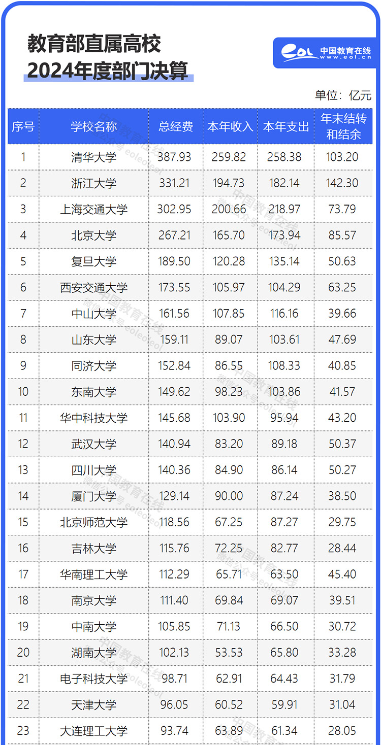 日前,75所教育部直屬高校官網(wǎng)均已公布2024年部門決算。據(jù)數(shù)據(jù)顯示,共有20所高??偨?jīng)費過百億。