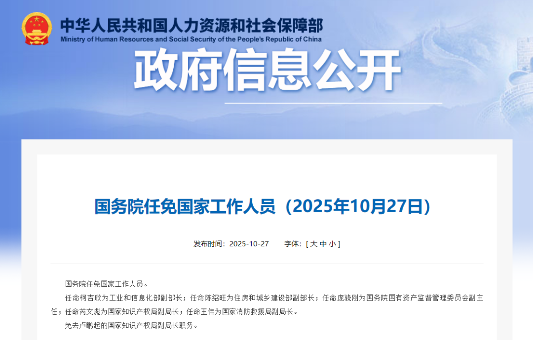 據(jù)人力資源和社會(huì)保障部網(wǎng)站10月27日消息,國(guó)務(wù)院任免國(guó)家工作人員:任命柯吉欣為工業(yè)和信息化部副部長(zhǎng)。